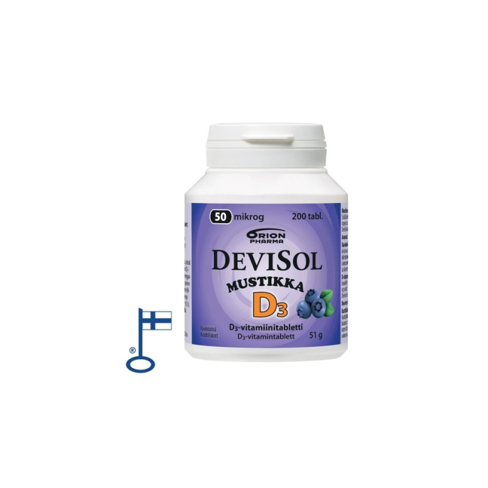 Devisol Mustikka 50 mikrog on aidon mustikan makuinen D-vitamiini puru-/imeskelytabletti. Makeutettu ksylitolilla ja sorbitolilla. Sisältää hyvin imeytyvää D3-vitamiinia. Saatavilla 200 tabl. pakkauksissa.