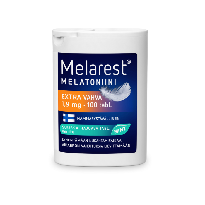 Melarest melatoniinivalmiste lyhentämään nukahtamisaikaa, lievittämään aikaeron vaikutuksia. Melarest Melatoniini Extra Vahva -makutabletit sisältävät 1,9 mg melatoniinia. Hyvänmakuiset, hammasystävälliset suussa hajoavat tabletit on helppo nauttia ilman vettä. Tuote sopii sekä satunnaiseen käyttöön että pidempiaikaiseen käyttöön. Melatoniini auttaa lyhentämään nukahtamisaikaa ja se auttaa myös lievittämään aikaeron yksilöllisiä vaikutuksia.
