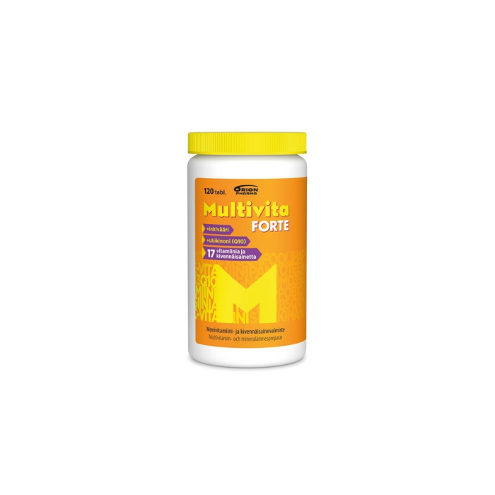 Multivita Forte on erityisesti ikääntyville kehitetty monivitamiini- ja kivennäisainevalmiste. Koostumukseltaan se sopii hyvin myös nuoremmille aikuisille. Yksi tabletti sisältää mm. 20 mikrogrammaa D3-vitamiinia, runsaasti foolihappoa ja B-ryhmän vitamiineja sekä bonuksena ubiqinon Q10:ntä ja ja inkivääriä. Ei sisällä jodia. Laktoositon (maidoton), gluteeniton, maidoton, sokeriton. Ei sisällä soijaa. Verenohennuslääkkeitä käyttävän on hyvä neuvotella käytöstä hoitavan lääkärin kanssa.