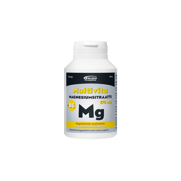 Multivita Magnesiumsitraatti+B6 175 mg on vahva magnesiumsitraattipurutabletti ja urheilijan ja kuntoilijan luottotuote! Yksi raikkaan ja hedelmäisen appelsiinin makuinen purutabletti sisältää 175 mg magnesiumia hyvin imeytyvässä sitraattimuodossa sekä 2 mg magnesiumin imeytymistä tukevaa B6-vitamiinia. Helposti suussa hajoavassa purutabletissa on miellyttävä rakenne, eikä se jätä jauhoista tai rakeista suutuntumaa. Ravintolisä.