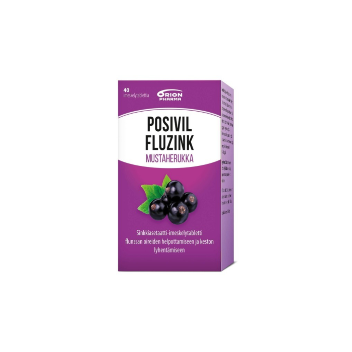Posivil FluZink sitruuna-lakritsi, veriappelsiini ja mustaherukka -imeskelytabletit ovat imeskeltäviä sinkkiasetaattitabletteja. Sinkki muodostaa suojaavan kalvon suun ja nielun alueelle, kun se imeskellään noin joka toinen tunti. Suuta ei kannata heti imeskelyn jälkeen huuhtoa vedellä, jotta sinkki ehtii suojata suun ja nielun pintaa. Helpottaa flunssan oireita. Lyhentää oireiden kestoa. Imeskelytableteista neljä makuvaihtoehtoa: vadelma-salmiakki, sitruuna-lakritsi, veriappelsiini ja mustaherukka. Posivil FluZink sopii aikuisille ja yli 12-vuotiaille lapsille. Varmista valmisteen sopivuus itsellesi apteekissa.