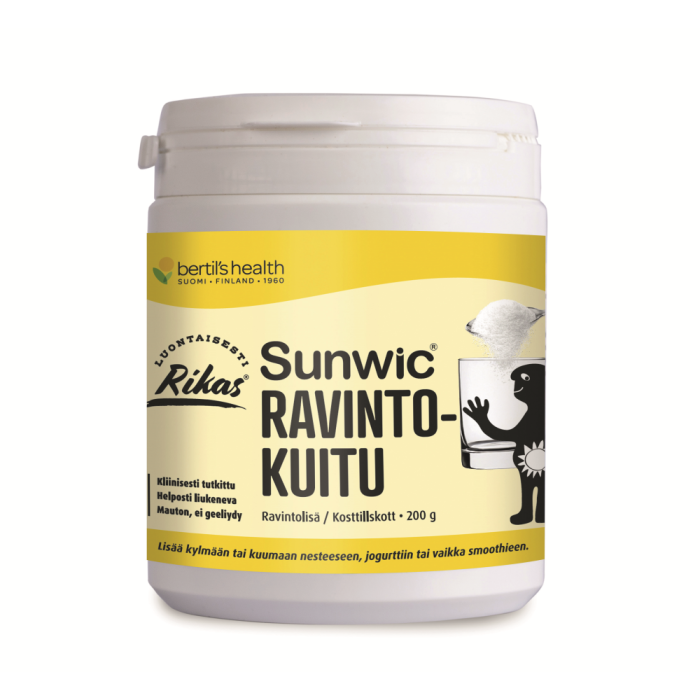 Sunwic Ravintokuitu on neutraalin makuinen jauhe, joka liukenee helposti nesteeseen geeliytymättä. Tuotteen sisältämä kuitu on kliinisesti tutkittua, guarpavuista muokattua liukoista kuitua (PHGG), joka on tärkeää ravintoa suolistomme bakteereille. Sunwic Ravintokuidun säännöllinen käyttö lisää merkittävästi bifidobakteerien määrää suolistossa. PHGG-kuitu aktivoi lisäksi suolistobakteereja tuottamaan useita aineenvaihduntatuotteita, kuten lyhytketjuisia rasvahappoja, propionaattia ja butyraattia.