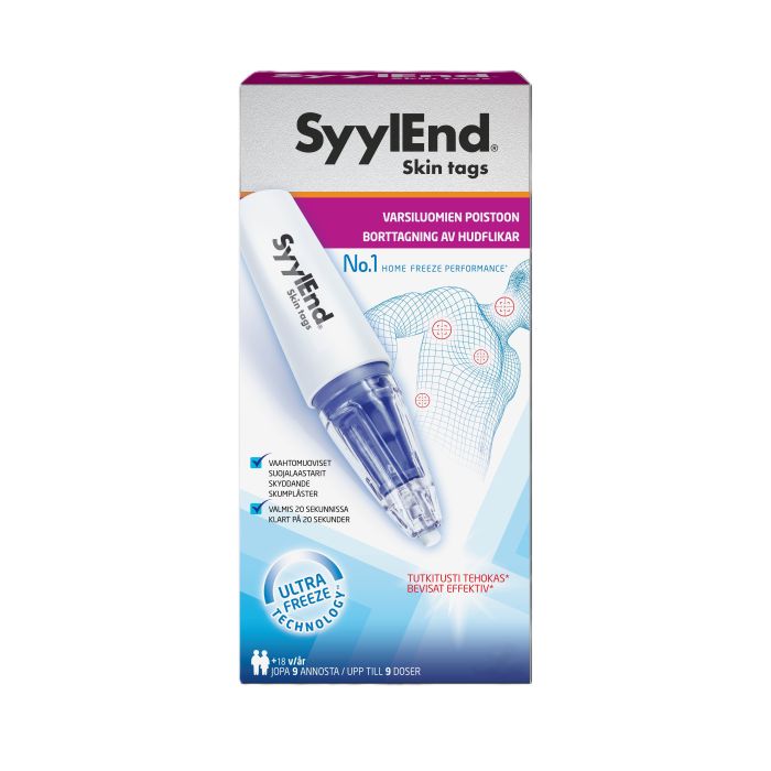 SyylEnd Skin tags är en frysbehandling för hudflikar på nacken, halsen, bröstet, armhålorna och underarmarna. Det är den första hembehandlingen för hudflikar med dikväveoxid, en mycket kall gas. Användningsändamål: SyylEnd Skin tags är en frysbehandling för hudflikar på nacken, halsen, bröstet, armhålorna och underarmarna. Läs bruksanvisningen noggrant före användning. Dosering: FÖRBEREDELSE: Applicera den självhäftande skyddande skumringen runt hudfliken för att skydda den friska huden. LADDA: Placera SyylEnd Skin tags upprätt på bordet med den genomskinliga korkdelen nedåt. Håll behållaren med ett stadigt grepp. Tryck den vita delen nedåt med den andra handen i exakt två sekunder. KONTROLLERA: Ta bort korken och du bör se isånga. Om det inte kommer någon isånga, upprepa laddningen. BEHANDLA: Tryck genast spetsen stadigt mot hudfliken i plåstret. Behandla hudfliken i exakt 20 sekunder. Innehåll: En förpackning innehåller en SyylEnd Skin tags (14,3 g flytande N2O), 9 utbytbara sp