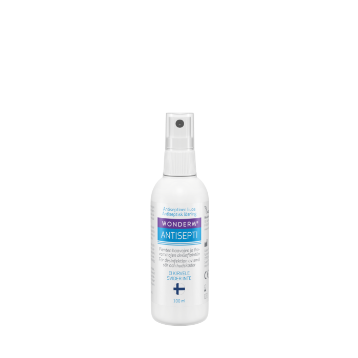 Wonderm AntiSepti är avsett för desinficering av små sår och hudskador. Denna antiseptiska lösning svider inte. Innehåller hudvårdande pantenol. Förpackad i praktisk sprayflaska på 100 ml. Wonderm AntiSepti tillverkas i Finland. CE-märkt medicinteknisk produkt.